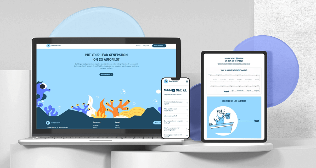 LeadAssist needed a high impact digital presence to support its mission of helping new business owners quickly start earning through LinkedIn and email outreach. They required a visually appealing, custom built website with fast performance, creative animations, and a conversion driven messaging strategy. The site had to repeatedly emphasize financial outcomes boosting leads and increasing revenue to motivate visitors to purchase plans immediately.
