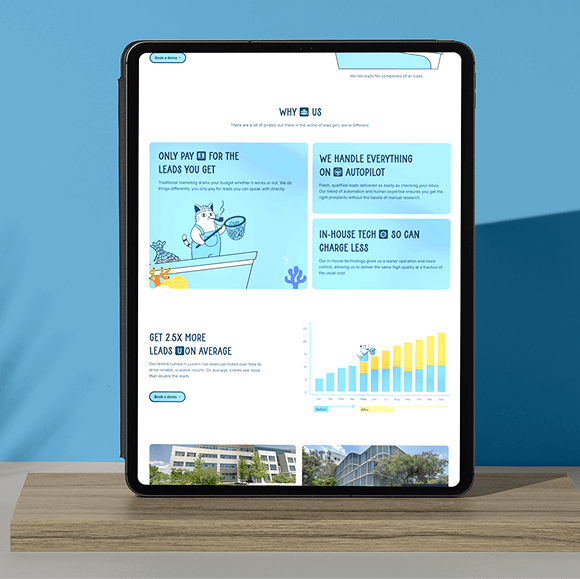 We achieved all the client’s goals by building a fast, professional Webflow site with a unique, visually appealing design. To drive sales, we added creative animations featuring a money focused character to illustrate Revenue growth. We simplified complex information into clear steps and highlighted key terms Leads and Revenue while offering straightforward packages and easy booking to streamline purchases for new business owners.